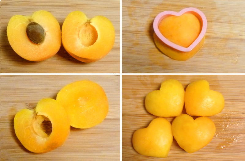 Halve your apricots. Trim the halves down so that they lay flat, and use a small heart cookie cutter to cut a heart out of each half. Place an apricot heart on top of the almond cream in each tart and push it down gently.
